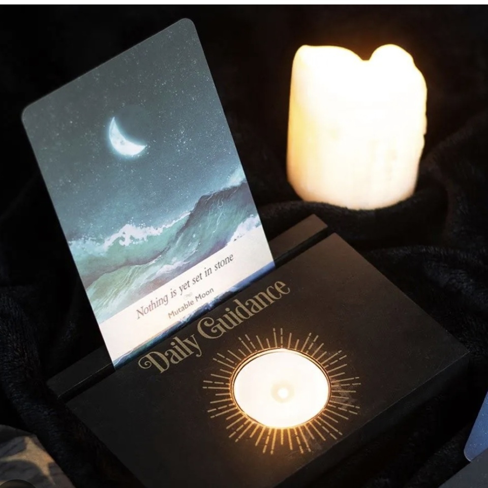 This black tarot card stand features an elegant design, combining a slot for daily guidance cards with a built-in tealight holder for added ambiance. Ideal for enhancing your tarot practice or as a stylish decor piece.